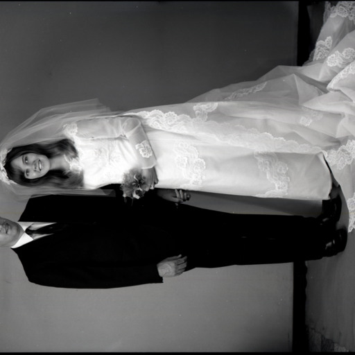 Photograph of an unidentified bride in her wedding dress and veil standing beside her new husband who is wearing a U.S. Navy uniform.