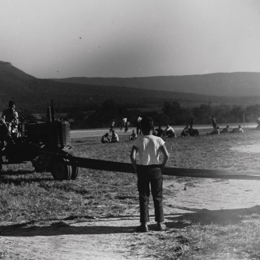 Photograph of attendees at a tractor event at the Triplett School Fair on October 19-20, 1950. The tractor driver pictured is Buddy Nyle Tisinger. The competition involved aligning tractor belts and pulley arrangement.