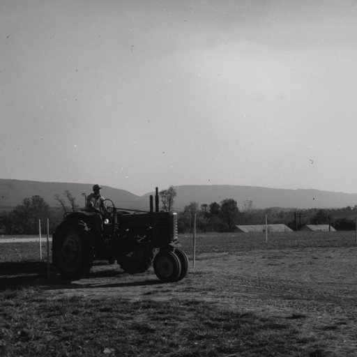 Photograph of a tractor event at the Triplett School Fair on October 19-20, 1950. The tractor competition involved driving the tractor and implement through a stake-marked course.
