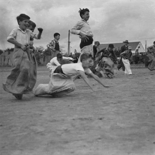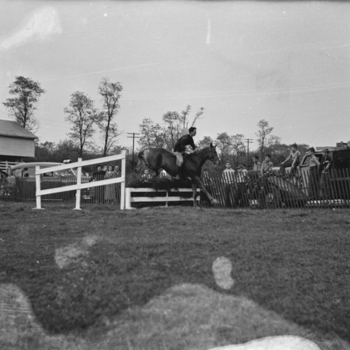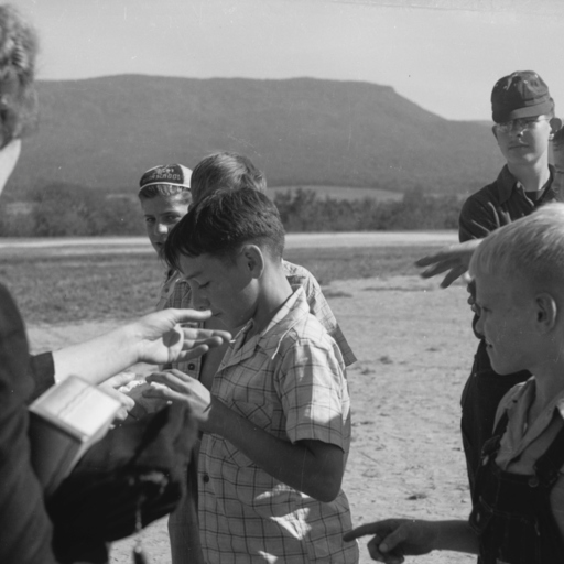 Photograph of participants at the Triplett School Fair taken on October 19-20, 1950. Triplett agriculture teacher Lawrence Bowers is visible in the background wearing glasses, coat, and tie.