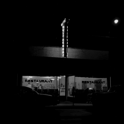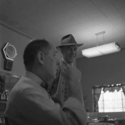 Candid photograph of Joe Walters (foreground), owner of Walters Restaurant, talking to Glen Spitzer (background), owner and operator of Spitzer Hardware, a store directly across the street from the restaurant, taken in February 1956.