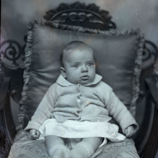 Unidentified baby is seated on a pillow on a chair. A discretely covered adult arm is visible on the left supporting the child.