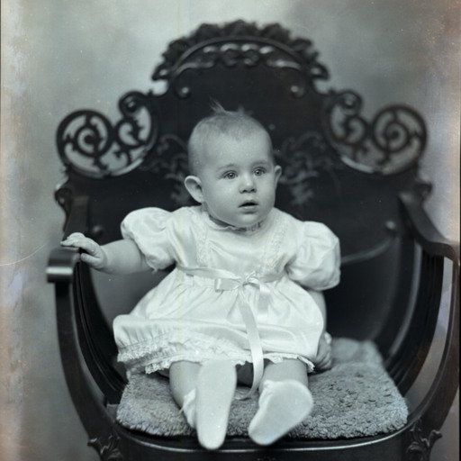Unidentified baby seated on a pillow on a chair. A discretely covered adult arm supporting the child is visible on the left.