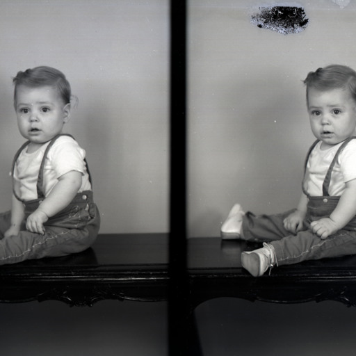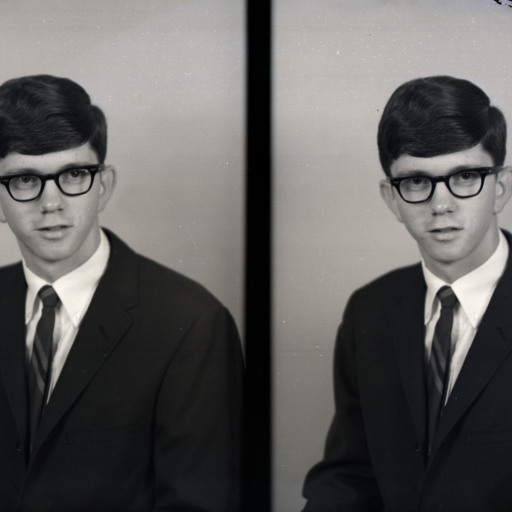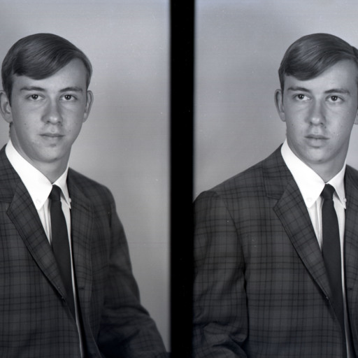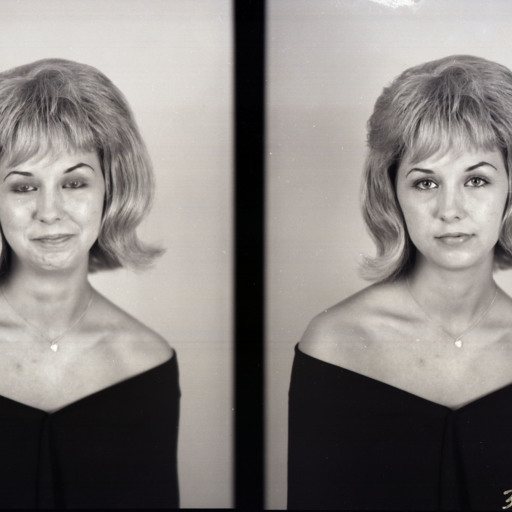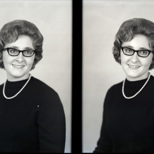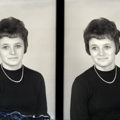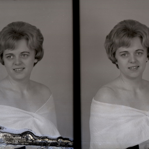 Photo of two separate portrait photographs of the same unidentified young woman, probably teenaged, with short blond hair and wearing a checkered, sleeveless top.