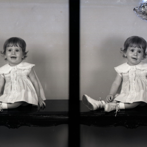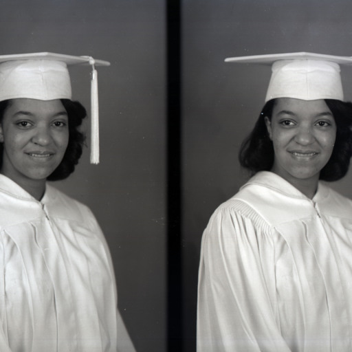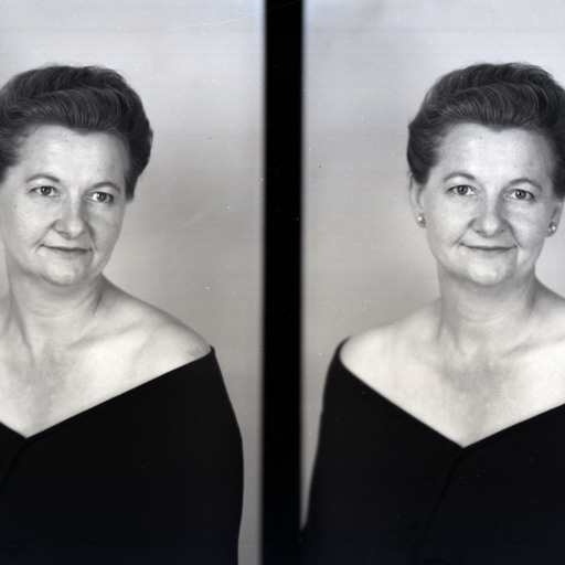 Photo of two separate portrait photographs of the same unidentified young woman, probably teenaged, with short hair and bangs. She is wearing a short-sleeved dress.