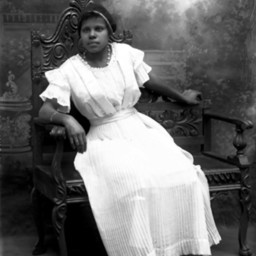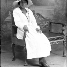 The image on the right is of an unidentified woman seated on a porch outdoors.