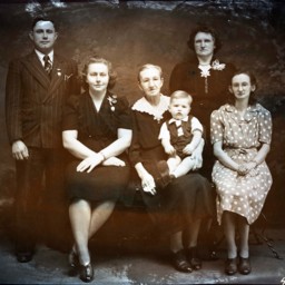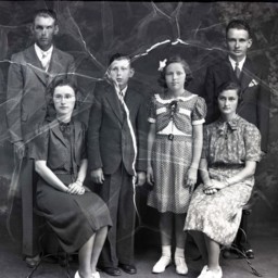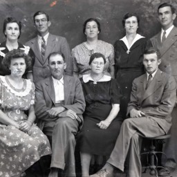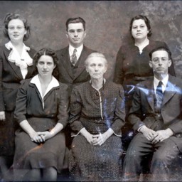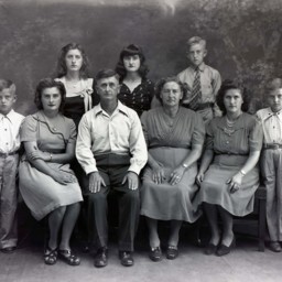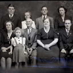 Unidentified older man and woman are seated with five unidentified young men and women of varying ages posed around them.