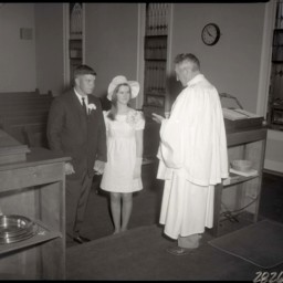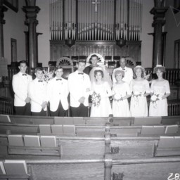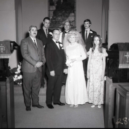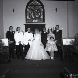 The bride and groom are in the middle with their respective attendants beside them. The unidentified minister and another man, possibly the bride's father, are standing behind…