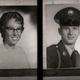 Photo of two separate portrait photographs of James McClure as a young man with glasses wearing a U.S. Army uniform.