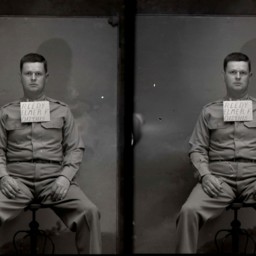 Photo of two images of Elmer Franklin Reedy as a young man seated on a chair and wearing a placard around his neck with his name and an eight digit number written on it. He is wearing a U.S. Army uniform.