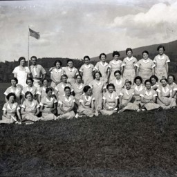 Group of unidentified women and one man posed together in three rows outdoors. These were employees of one of the area's Casey Jones plants photographed at the Endless Caverns in New Market.