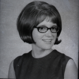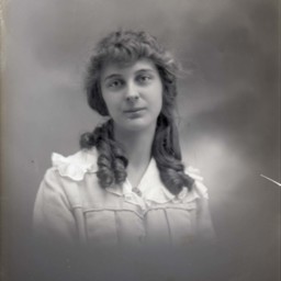 Photograph of a portrait of an unidentified young woman. A piece of paper with an oval cutout is overlaid on top of the portrait, but it does not cover the full picture.