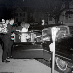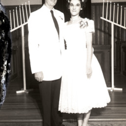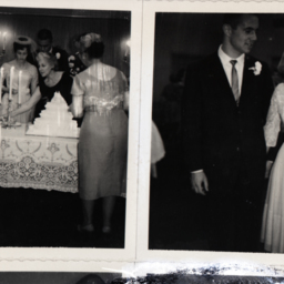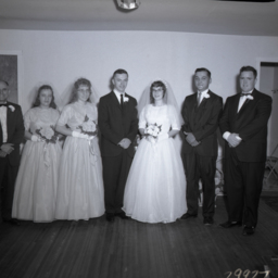 Photograph of Richard Miller and Diana (Comer) Miller in their wedding attire and flanked by their parents. They married in Edinburg in March 1964.