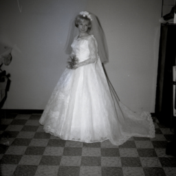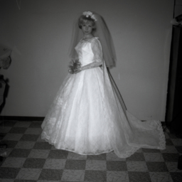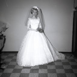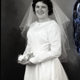 Unidentified bride standing in her wedding gown, veil, and bouquet.