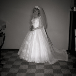 Photo of two separate photographs of Brenda Kay Vann as a young bride in her wedding gown, veil and bouquet.