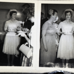 Photo of two separate photographs of Carolyn Ann (Eastep) Gochenour as a young bride in her wedding dress and veil.