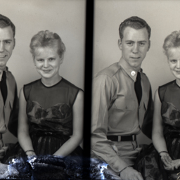 Photo of two portrait photographs of an unidentified young man wearing a uniform and seated beside an unidentified young woman with her hair pulled up and wearing a sleeveless dress.