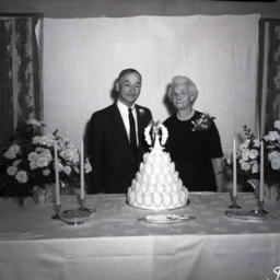 On the left, the unidentified bride and others are standing behind the multi-tiered wedding cake.