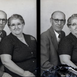 Photo of two separate portrait photographs of the same unidentified older man and woman posed together.