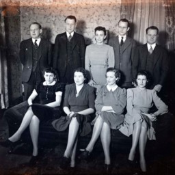 Unidentified older man and woman are seated with five unidentified young men and women of varying ages posed around them.