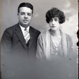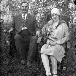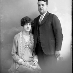On the left is an unidentified bride and groom. She is wearing a wedding veil and he is wearing a military uniform.