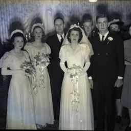 On the left is an unidentified bride and groom. She is wearing a wedding veil and he is wearing a military uniform.
