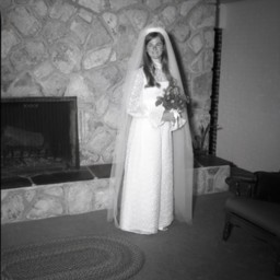 Unidentified bride with long hair is standing in her wedding dress, veil, and bouquet of flowers. The photograph was taken in front of a living room fireplace.