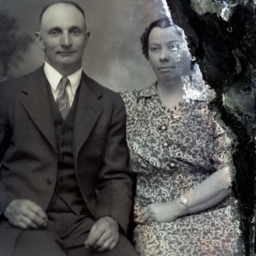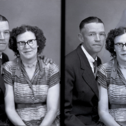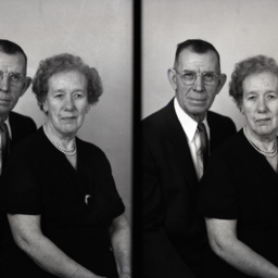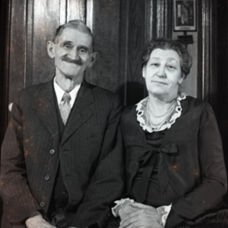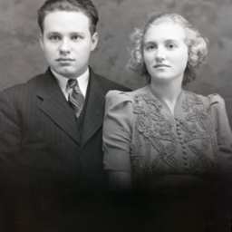 The man is wearing a suit and tie. The woman has short curly hair and buttons down the front of her dress.