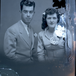 The man is in a suit and the woman is wearing a hat and a corsage pinned to the lapel of her jacket.