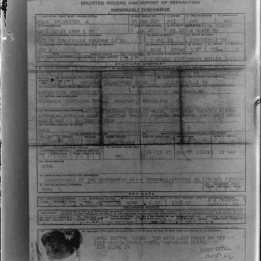 Photograph of the government form used to honorably discharge Private Sylvester A. Polk of Conicville, Virginia, from the U.S. Army.