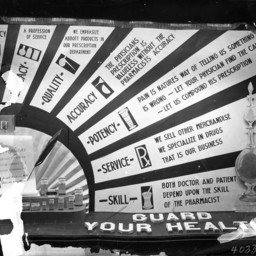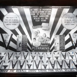 Photograph of an advertisement by Rexall Drug Store that displays a variety of Puretest Vitamin Products and tells patrons "Your health is the first line of defense. Fortify your system with Puretest Vitamins".