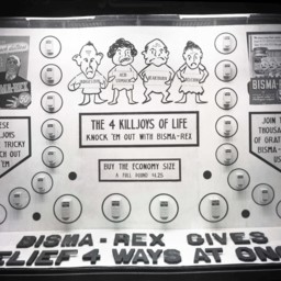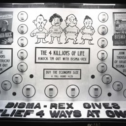 Photograph of an advertisement for Bisma-Rex, a product promising to give relief from indigestion, acid stomach, heartburn, and belching.