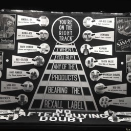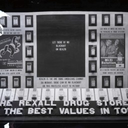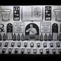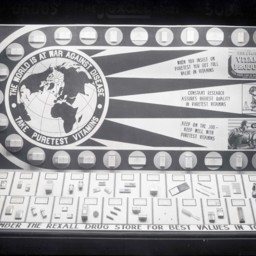 Photograph of an advertisement by Rexall Drug Store that displays a variety of United Drug Products and urges patrons to "Bring your prescriptions here".