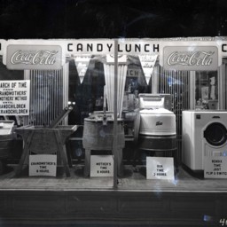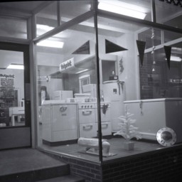 Photograph taken at night of Hotpoint appliances on display in an appliance store that was located in the Schmitt Building.
