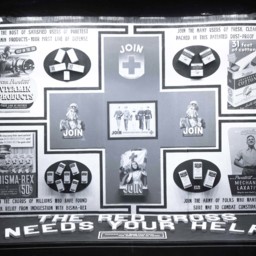 Photograph of a window display featuring products like Puretest Vitamins and Bisma-Rex, along with a notation at the bottom that reads, "The Red Cross needs your help" and a large cross in the middle of the image with messages about joining the…