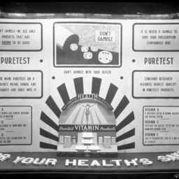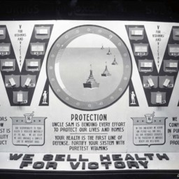 Photograph of an advertisement for Puretest Vitamin products with the slogan, "We Sell Health for Victory".