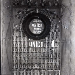 Photo of an advertising display featuring UNICO Tires and two types of motor oil: Mioco and Bureau Penn.