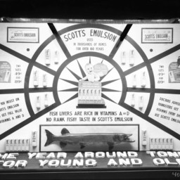 Photograph of a window display for Scott's Emulsion, a product billed as being "the year around Tonic for young and old".