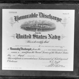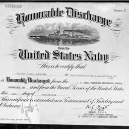 Photograph of the document certifying that Motor Machinist's Mate Second Class Charles Everett Alexander was honorably discharged from the Navy in Bainbridge, Maryland, on January 25, 1946.