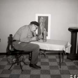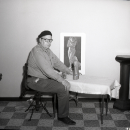 Unidentified man wearing an artist's beret is seated beside a sculpture and a drawing of a woman.