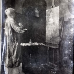 Unidentified woman with her hair pulled back and holding a paint brush is standing in front of a painting on an artist's easel.
