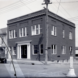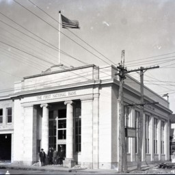 Photograph of the National Bank of Woodstock building located on the corner of E. Court and N. Main Streets in Woodstock. Vintage automobiles are visible on the left and right of the image.