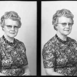 Photo of two separate images of B. Virginia (Heizer) Bashaw with short hair, glasses, and wearing a print dress.