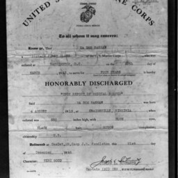 Photograph of paperwork pertaining to Ma Don Bashaw's discharge from the U.S. Marine Corps in 1944.
