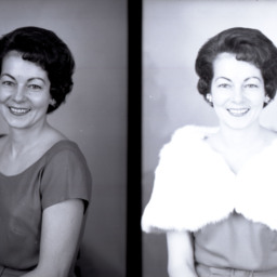 In the right image, she is wearing a fur stole. In the left image, she is not.