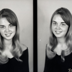 Photo of two separate portrait photographs of Sheila Berchdorff as a young woman with long hair.