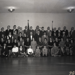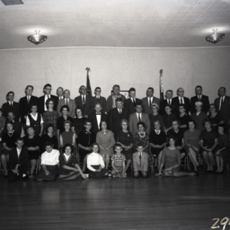 Group of attendees (and their families) of the 30th reunion of Woodstock High School's Class of 1932 posed together.