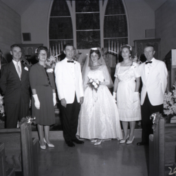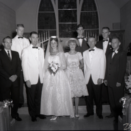 Photograph of the bride and groom, Billie (Beydler) Racey and Doug Racey, standing with members of the wedding party.