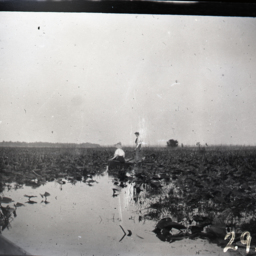 Photo of a photograph of an unidentified woman seated in a small boat with an unidentified man standing by her. The original image was taken in a wide, marshy area.