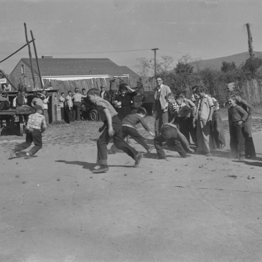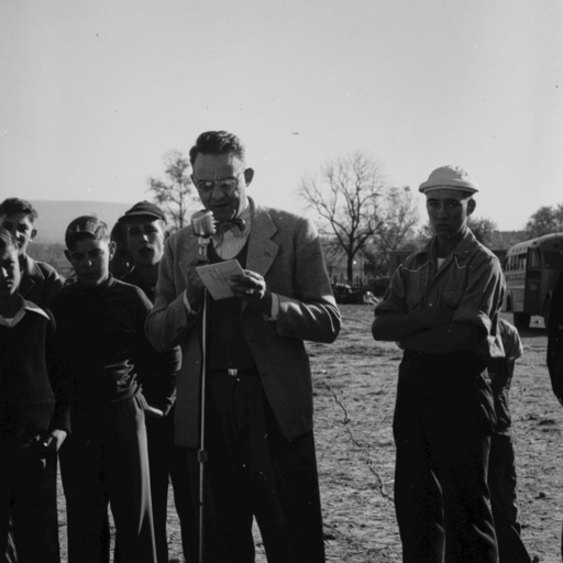 Photograph of participants at the Triplett School Fair taken on October 19-20, 1950. Pictured on the right wearing a coat, tie, and glasses is Triplett agriculture teacher Lawrence Bowers.